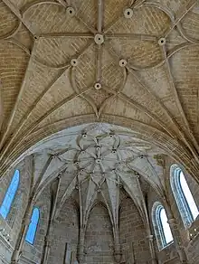 La galería adosada al muro norte contiene dos puertas cegadas, una era para entrada de los fieles y otra para el servicio del convento en los casos de absoluta necesidad. Las elevadas bóvedas son todas de crucería con las claves salientes o colgantes, a modo de estalactitas, y rasgadas ventanas de arcos semicirculares abocinadas. La cornisa sobre la que descansan las bóvedas, y los arcos fajones, se apoya a la vez en esbeltas columnas, integradas en los muros hasta la mitad de los fustes y estriadas desde sus pedestales hasta los capiteles.