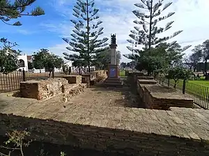 ![]() Ruinas del Convento de Santa María La Bella con el monumento conmemorativo de 1985 ubicado en el centro. | ||