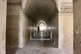 El interior está conformado en su parte principal por un gran claustro cuadrangular de dos niveles, el cual se encuentra rodeado por corredores. El claustro en su primer nivel está conformado por 5 arcos de medio punto en cada uno de sus lados, alternados por gruesos contrafuertes. En su segundo nivel el claustro está conformado por un par de arcos de tres puntos sobre cada arco del primer nivel, siendo un total de 10 arcos de cada lado del claustro. Asimismo cada par de arcos también están alternados por contrafuertes que vienen del primer nivel.