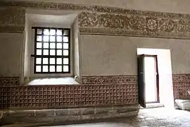 Los muros de los corredores del claustro están decorados con murales a manera de guardapolvos en su parte inferior y cenefas en su parte superior. En algunas áreas de los corredores de la planta baja se encuentran representadas escenas de la Pasión de Cristo y en la planta alta pasajes de la vida de la Virgen María.
