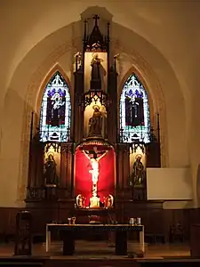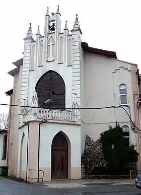 La iglesia del Convento fue finalizada y consagrada en 1913. Se trata de un templo de reducidas dimensiones y muy austera fábrica, con única planta de tramo corto, cabecera recta, tejado de dos aguas y una fachada irregular en la que se proyecta, en la parte inferior, un vestíbulo de acceso en forma de punta de diamante, el cual sostiene un sencillo balcón sin acceso; la fachada se remata en su parte superior con una discreta espadaña. Se trata de un edificio funcional y sin apenas elementos decorativos, aunque por sus vanos de arco apuntado y los pináculos que rematan el frontispicio podría hablarse de un vago estilo neogótico. El mobiliario que contiene la iglesia consiste en tallas religiosas de factura moderna.