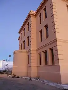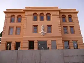 La fachada principal y la posterior tienen un cuerpo central más avanzado, que comprende tres aberturas por piso. En la planta baja, en el sector central posterior sobresale el ábside de la capilla. A cada lado del cuerpo que sobresale, hay dos ventanas por piso. En la parte posterior, las aberturas, se disponen de manera irregular y en las fachadas laterales se muestra tres aberturas por piso. Las ventanas del segundo piso de la fachada principal son de arco de medio punto; el resto, cuadrangulares. Todo el edificio está revocado, simulando sillares en los ángulos.[2]