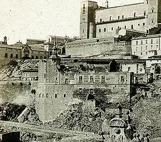 ![]() Fotografía de 1858, en la que se aprecian los restos del Convento del Carmen Calzado, con chapitel incluido. También se pueden ver a la izquierda el antiguo Hospital de Santiago, y arriba parte del Alcázar.[1] | ||