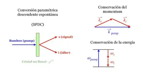 Un cristal no lineal se utiliza para dividir haces de fotones en pares de fotones que, siguiendo las leyes de la conservación de la energía y de la conservación del momentum, tienen energías y momentums que combinadas igualan las del fotón y la correspondiente red cristalina. Dado que el índice de refracción de un cristal cambia con la frecuencia, solo ciertos tripletes de frecuencias serán coincidentes en fase de modo que tanto la conservación de la energía como la del momentum se cumplan de manera simultánea. La manera más común de obtener una coincidencia en fase es a través de materiales no lineales birrefringentes, cuyo índice de refracción cambia con la polarización de la luz incidente. Como resultado, los distintos tipos de SPDC se clasifican dependiendo de las polarizaciones del fotón de entrada (pump) y de los dos fotones de salida (signal e idler).