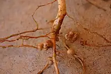 Un ejemplo clásico de mutualismo es la interacción entre rizobios bacterias del suelo y leguminosas (Fabaceae). En esta interacción, las bacterias rizobias inducen la formación de nódulos de la raíz en plantas leguminosas a través de un intercambio de señales moleculares.[24] Dentro de los nódulos de la raíz, los rizobios fijan el nitrógeno atmosférico en amoníaco utilizando la enzima nitrogenasa. La leguminosa se beneficia de un nuevo suministro de nitrógeno utilizable de los rizobios, y los rizobios se benefician de las fuentes de energía de ácido orgánico de la planta, así como de la protección proporcionada por el nódulo de la raíz. Dado que los rizobios viven dentro de la leguminosa, este es un ejemplo de endosimbiosis, y como tanto las bacterias como la planta pueden sobrevivir independientemente, también es un ejemplo de simbiosis facultativa.