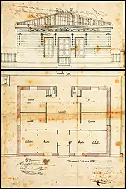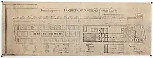 En 1881 Gaudí delineó el plano general de la cooperativa, a escala 1:666, que fue publicado en forma de folleto junto con un texto que explicaba la historia y el reglamento de la sociedad. En el plano se ve la disposición del conjunto, dispuesto a lo largo de la calle de la Merced y compuesto de casino, fábrica y barrio obrero. Frente al casino estaban la entrada, la portería y la báscula, así como un jardín; venía luego la fábrica y el pabellón de servicios; tras un pórtico de entrada venía a continuación el barrio de casas, formado por quince casas pareadas, es decir, treinta viviendas. Más tarde, en 1883, el arquitecto presentó el proyecto para la construcción de la báscula y la portería, que fue autorizado por Cabanyes, que por entonces era arquitecto municipal de Mataró.[16]
