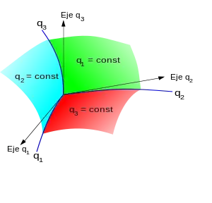 Las superficies q1 = constante, q2 = constante, q3 = constante se denominan superficies de coordenadas; y las curvas espaciales formadas por su intersección dos a dos se denominan curvas de coordenadas. Los ejes de coordenadas están determinados por las tangentes a las curvas de coordenadas en la intersección de tres superficies. En general, no son direcciones fijas en el espacio, como ocurre con las coordenadas cartesianas simples y, por lo tanto, generalmente no existe una base global natural para las coordenadas curvilíneas.