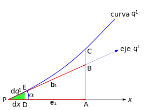 Considérese la curva unidimensional que se muestra en la Fig. 3. En el punto P, tomado como origen, x es una de las coordenadas cartesianas y q1 es una de las coordenadas curvilíneas. El vector de la base local (no unitario) es b1 (anotado como h1 anteriormente, con la letra b reservada para los vectores unitarios) y está construido sobre el eje q1 que es tangente a esa línea de coordenadas en el punto P. El eje q1 y, por lo tanto, el vector b1 forman un ángulo con el eje cartesiano x y el vector de la base cartesiana e1.