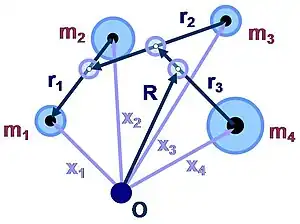 El vector R es el centro de gravedad de todos los cuerpos: