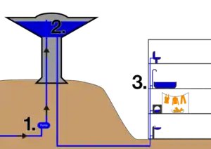 La altura de la torre proporciona la presión para el sistema de suministro de agua y se puede complementar con una bomba. El volumen del depósito y el diámetro de la tubería proporcionan y mantienen el caudal. Sin embargo, depender de una bomba para proporcionar presión es caro; para mantenerse al día con la demanda variable, la bomba debería tener el tamaño adecuado para satisfacer las demandas máximas. Durante los períodos de baja demanda, las bombas jockey se utilizan para cumplir con estos requisitos de flujo de agua más bajos. La torre de agua reduce la necesidad de consumo eléctrico de bombas cíclicas y, por tanto, la necesidad de un costoso sistema de control de bombas, ya que este sistema tendría que tener el tamaño suficiente para proporcionar la misma presión a altos caudales.