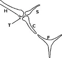 En otros tetrápodos, forma la unión entre la escápula y el esternón, tiene una muesca en la superficie dorsal, que junto con la muesca vertebral en la superficie ventral de la escápula, forman la unión en la cual se encuentra la porción proximal del húmero.