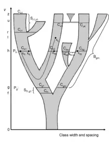 - El diámetro de un árbol disminuye continuamente desde el tronco hasta las ramitas, una propiedad sin implicaciones filogenéticas, mientras que los corales pueden ser incluso más anchos arriba que abajo, simbolizando mejor el cambio temporal de la riqueza taxonómica o el tamaño de la población;