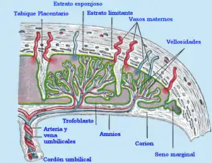 En mamíferos placentarios, el cordón umbilical es un cordón que une un embrión en vías de desarrollo o feto a su placenta. Contiene arterias principales y venas (las arterias umbilicales y vena umbilical) para el intercambio de sustancias nutritivas y sangre rica en oxígeno, entre el embrión y la placenta. Cuando el feto nace, el cordón umbilical se corta y se deja solo una pequeña cicatriz (el ombligo).[1]