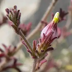 Es una hierba anual, de color rojo gris verdoso, y de textura peluda, glandular y pegajosa. Crece de 20 a 60 centímetros de altura.[3] La inflorescencia lleva flores acompañadas de brácteas de color rojo verdoso peludas y lobuladas. La flor mide hasta 2 centímetros de largo, formada por una bolsa rosa con vetas oscuras envuelta en sépalos más oscuros.[1]