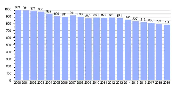 | Gráfica de evolución demográfica de Coristanco entre 2000 y 2019 |