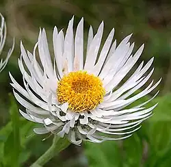 Las inflorescencias son capítulos asentados sobre pedúnculos con hojas. Los capítulos se disponen en corimbos o en forma solitaria. Su tamaño alcanza 3-6 cm de diámetro. Poseen brácteas que se distinguen por ser muy estrechamente oblongas, acuminadas y blancas. Las brácteas externas son muy delgadas.[3]