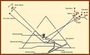 Además, los llamados “canales de ventilación” de la Gran pirámide de Guiza, descubiertos por R. Howard Vyse, y W. Dixon apuntan directamente a las estrellas. Las del lado sur apuntan a la constelación de Orión (desde la cámara del rey) y a la estrella Sirio (desde la cámara de la reina). Las cámaras del lado norte apuntan a la Osa Menor (desde la cámara de la reina) y a Alfa Draconis o Thuban (desde la cámara del rey), la estrella que hace unos 4800 años marcaba el norte.