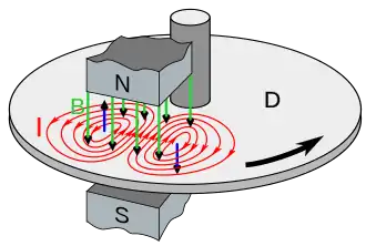 Un imán induce corrientes eléctricas circulares en una placa metálica que se desplaza a través de su campo magnético. Ver el esquema ala derecha. El esquema muestra una placa metálica (C) que se desplaza hacia la derecha bajo un imán estacionario. El campo magnético (B, flechas verdes) del polo Norte del imán atraviesa la placa hacia abajo. Dado que la placa se está desplazando, el flujo magnético a través de un área de la placa varía. En el sector de la placa que se desplaza bajo el lateral de ataque del imán (lado izquierdo) el campo magnético a través de un punto de la placa aumenta ya que se está aproximando al imán, dBdt > 0. Por la ley de inducción de Faraday, ello genera un campo eléctrico circular en la placa en una dirección antihoraria alrededor de las líneas del campo magnético. Este campo induce un flujo de corriente eléctrica en sentido contrario a las agujas del reloj (I, rojo), en la lámina. Esta es la corriente de Foucault. En la parte de la lámina bajo el borde de salida del imán (lado derecho) el campo magnético a través de un punto dado de la lámina va disminuyendo a medida que se aleja del imán, {sfrac < 0}}, induciendo una segunda corriente de Foucault en sentido horario en la lámina.