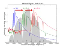 Como los filtros fotométricos son sensibles a un rango de longitudes de onda y la técnica se basa en hacer muchas suposiciones sobre la naturaleza del espectro en la fuente de luz, los errores para este tipo de mediciones pueden variar hasta δz = 0.5 y son mucho menos confiables. que las determinaciones espectroscópicas.[7] En ausencia de suficiente tiempo de telescopio para determinar un corrimiento al rojo espectroscópico para cada objeto, la técnica de corrimientos al rojo fotométricos proporciona un método para determinar una caracterización al menos cualitativa de un corrimiento al rojo. Por ejemplo, si un espectro similar al Sol tuviera un corrimiento al rojo de z = 1, sería más brillante en el infrarrojo que en el color amarillo verdoso asociado con el pico de su espectro de cuerpo negro, y la intensidad de la luz se reducirá en el filtrar por un factor de dos (es decir, 1+z) (consulte la corrección K para obtener más detalles sobre las consecuencias fotométricas del corrimiento al rojo).[8]