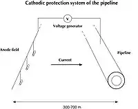 ![]() Esquema de un sistema de protección catódica por corriente impresa para proteger una tubería. |
