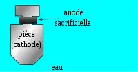 ![]() Esquema de protección de una pieza metálica mediante un ánodo de sacrificio unido a dicha pieza para prevenir la corrosión. |