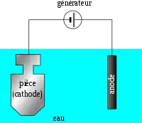 ![]() Esquema de protección catódica mediante corriente impresa para prevenir la corrosión de una pieza metálica. |