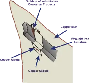 Un ejemplo anterior ocurrió en la fragata de la Royal Navy HMS Alarm. El casco de madera de la embarcación había sido revestido de cobre para evitar el ataque de los percebes. Pronto se descubrió que la cubierta se había desprendido del casco en muchos lugares, porque los clavos de hierro que habían sido utilizado para fijar el cobre a la madera se habían corroído completamente. Una inspección más detallada reveló que algunos clavos, que estaban menos corroídos, estaban aislados del cobre por un papel marrón que estaba atrapado bajo la cabeza del clavo. El cobre había sido entregado al astillero envuelto en el papel que no se quitó antes de que dichas planchas fueran clavadas al casco. La conclusión obvia, pues, y la que figura en un informe al Almirantazgo de 1763, fue que no se debe permitir el contacto directo del hierro con el cobre en un entorno de agua de mar si se quiere evitar una severa corrosión del hierro. Más tarde, los buques se han diseñado teniendo esto en cuenta. No sólo el agua de mar era un electrolito muy bueno, debido a su alta concentración de sal, sino que el ataque de los clavos fue favorecido por su área de exposición tan pequeña en comparación con el de la cubierta de cobre del casco.