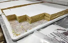 La forma final de presentarse el cortaíllo es espolvoreando azúcar glas y luego cortándolo con la forma y tamaño de una ficha de dominó, o un poco más grande.