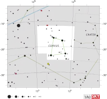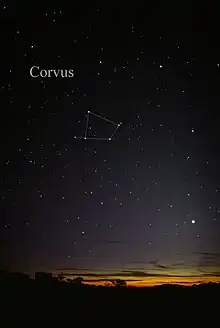 Corvus ("cuervo" en latín) es una constelación pequeña con sólo 11 estrellas visibles a simple vista. γ Corvi (Gienah Gurab) y δ Corvi (Algorab) sirven de indicadoras para encontrar a Espiga (α Virginis).