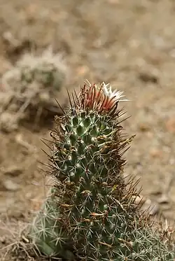 Crece solitaria, su tallo es de forma cilíndrica a columnar, con una altura de hasta 25 cm y 8 cm de ancho, de color verde grisáceo con algunos puntos blancos. Los tubérculos son pequeños, de 8 mm de largo, la base de 7 mm de ancho y de forma cónica. Las areolas de 2 mm de ancho y 4 mm de largo. Tiene 15 a 18 espinas radiales, de 11 mm de largo, de color blanco, amarillentas en la base y pardas en el ápice. No tiene espina central, aunque, en ocasiones llega a tener una, es recta y de 8 a 15 mm de largo de color amarillo y con la base y ápice pardos. La flor es pequeña de 22 mm de largo de color crema con una franja media púrpura rojiza, los filamentos son rojizos con las anteras amarillas. El fruto que produce es jugoso, de color verde opaco a amarillento, de 12 mm de largo y 6 mm de ancho. La semilla de solo 1 mm de ancho y de color pardo claro.[3][4]