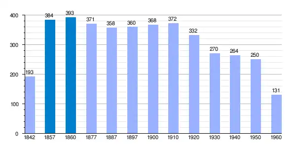 | Gráfica de evolución demográfica de Coscojuela de Sobrarbe[2] entre 1842 y 1960 |