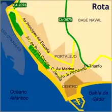 Rota es un municipio español y ciudad española situada en la provincia de Cádiz, en la comunidad autónoma de Andalucía. Su extensión superficial es de 84 km² y limita con las ciudades de Chipiona, Sanlúcar de Barrameda y El Puerto de Santa María. Se encuentra situada a una altitud de 9 metros y a 51 kilómetros de la capital de provincia, Cádiz. En el año 2012 contaba con 29 094 habitantes, con una densidad de 339,44 hab/km². Según el INE, a fecha de 1 de enero de 2017 contaba con 28 996 habitantes. Pertenece a dos mancomunidades, la Mancomunidad de Municipios Bahía de Cádiz;[2] de la que forma parte desde el año 1997[3] junto a los municipios de Cádiz, Jerez de la Frontera, El Puerto de Santa María, San Fernando, Chiclana de la Frontera y Puerto Real, y la Mancomunidad de Municipios del Bajo Guadalquivir que la conforman, entre otros, municipios de la Costa Noroeste.
