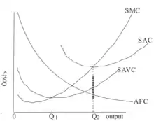A corto plazo, la empresa tiene algunos costes que son fijos independientemente de la cantidad de producción (por ejemplo, edificios, maquinaria). Otros costes, como la mano de obra y los materiales, varían con la producción y, por tanto, aparecen en el coste marginal. El coste marginal puede descender primero, como en el diagrama, si el coste adicional por unidad es elevado si la empresa opera con un nivel de producción demasiado bajo, o puede empezar plano o subir inmediatamente. En un momento dado, el coste marginal aumenta a medida que el aumento de los insumos variables, como la mano de obra, ejerce una presión creciente sobre los activos fijos, como el tamaño del edificio. A largo plazo, la empresa aumentaría sus activos fijos para corresponder a la producción deseada; el corto plazo se define como el periodo en el que esos activos no pueden modificarse.