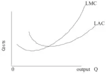 El largo plazo se define como el periodo de tiempo en el que ningún insumo es fijo. Todo, incluido el tamaño del edificio y la maquinaria, puede elegirse de forma óptima para la cantidad de producción deseada. Por consiguiente, aunque el coste marginal a corto plazo aumente debido a las limitaciones de capacidad, el coste marginal a largo plazo puede ser constante. O puede haber rendimientos crecientes o decrecientes a escala si la productividad tecnológica o de gestión cambia con la cantidad. O pueden darse ambos casos, como en el diagrama de la derecha, en el que el coste marginal primero disminuye (rendimientos crecientes a escala) y luego aumenta (rendimientos decrecientes a escala).[3]