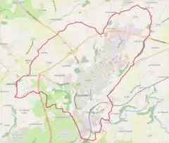 ![]() Vista de Coutances desde el Nordeste.A la izquierda el campanario de la iglesia de San Pedro, a la derecha los de la iglesia de San Nicolás y el Ayuntamiento. | ||
