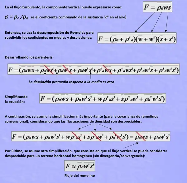 En términos matemáticos, el "flujo de remolinos" se calcula como la covarianza entre la desviación instantánea en la velocidad vertical del viento () del valor medio () y la desviación instantánea en la concentración de gas, proporción de mezcla (), de su valor medio (), multiplicado por la densidad media del aire (). Varias operaciones y suposiciones matemáticas, incluida la descomposición de Reynolds, intervienen para pasar de ecuaciones físicamente completas del flujo turbulento a ecuaciones prácticas para calcular el "flujo de remolinos", como se muestra a continuación.