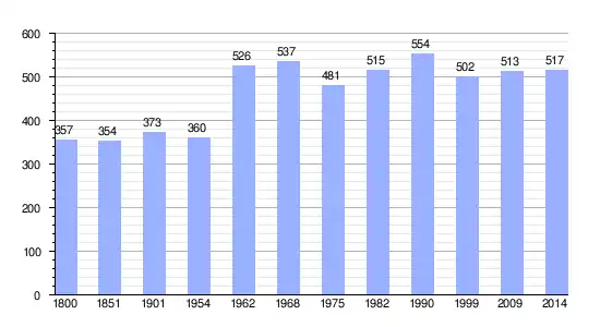 Los datos demográficos contemplados en este gráfico de la comuna de Crèvecœur-en-Auge[4] se han cogido de 1800 a 1999 de la página francesa EHESS/Cassini, y los demás datos de la página del INSEE.[5]