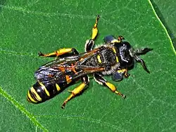 Puede alcanzar una longitud corporal de 11 a 18 milímetros (0,43 a 0,71 pulgadas) (hembras) o de 9 a 17 milímetros (0,35 a 0,67 pulgadas) (machos). Estas avispas tienen un cuerpo negro y amarillo.[2]
