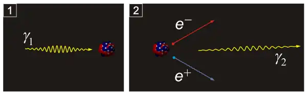 Es característica la reacción γ → e+ + e- , donde el fotón debe tener al menos una energía igual a la masa del electrón y el positrón (ambos tienen una energía en reposo de 511 keV), es decir, 1.022 keV o 1,022 MeV, para poder generar las partículas. Generalmente este proceso viene seguido del inverso, en el que el positrón generado se aniquila con un electrón de la materia que existe alrededor.