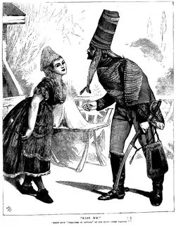 La mujer descubre su intención, y como castigo por su falsedad[33] la condena a besar y abrazar a todo el que encuentre. La niña llora y protesta, alegando que es demasiado tímida como para comportarse así, pero el hada le asegura que «superaría la timidez después de uno o dos años de estar hechizada».[33] Boomblehardt es el siguiente en aparecer, y Pipette se arroja hacia él, gritando «¡Bésame!». Él la empuja a un lado, por lo que ella responde «¡Cómo te atreves a tomarte tales atributos! ¡Anciano insolente! Bésame». El avaro acepta. Ella le golpea las orejas con las manos, confundiéndolo, y luego corre hacia la posada llorando a gritos.[34]