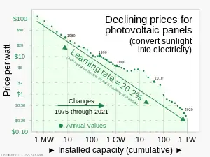 Como consecuencia, el coste de la energía solar fotovoltaica ha declinado significativamente debido a las mejoras en tecnología y economías de escala, sobre todo cuando la producción de módulos y células solares empezó a dispararse en China.[3] Desde entonces, el despliegue de la fotovoltaica se está produciendo a cada vez mayor escala, particularmente en Asia pero también en América del Norte y otras regiones, donde la energía solar está compitiendo cada vez más con fuentes de energía convencional, al alcanzarse la paridad de red en aproximadamente 30 países.[4]: 9