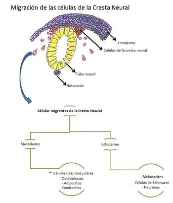 Estas células pueden migrar por dos rutas diferentes, una temprana ventral o una tardía dorsolateral. Además dan lugar a muchos derivados celulares tales como células del sistema nervioso periférico y células de schwann.[14][15]