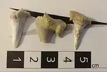 Ejemplares de dientes de la especie tiburón Cretolamna appendiculata,Agassiz, 1843, provenientes de afloramientos de la Formación Roca, Cuenca Neuquina, provincia de Río Negro, Argentina.