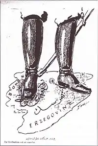 Austria-Hungría ejerció estos derechos ocupando Bosnia y Herzegovina y manteniendo un control compartido con los otomanos del Sanjacado de Novi Pazar. Esta situación persistió desde 1878 hasta el estallido de la crisis en 1908. El Tratado de Berlín también estipulaba que los estrechos del mar de Mármara quedarían cerrados a los buques de guerra en caso de conflicto, lo que en la práctica encerraba a la flota de guerra rusa en el mar Negro en caso de hostilidades. Estos territorios recobraron una paz relativa a partir de mediados de la década de 1880, tras una breve campaña militar en 1878 para someterlos a la autoridad imperial.[7][8] Tanto los dirigentes imperiales en Viena como las autoridades que administraban los territorios deseaban hacer de ellos una muestra para el resto de Europa de lo que suponía el sistema de gobierno habsburgo en el centro del continente.[9] El deseo de controlar estos nuevos territorios llevó a la realización de varios censos; el primero se hizo en 1879 y el segundo, en 1885.[10] Al mismo tiempo, los administradores encargados por Viena de gestionar los valiatos intentaron favorecer su desarrollo económico[11] mediante inversiones con fondos de las dos mitades del imperio, Cisleitania y Transleitania. La pujanza de la economía allanó además la unificación legal con el resto del imperio.[12]