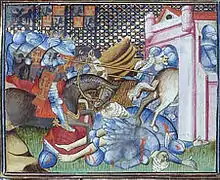 Ilustración medieval que muestra a las tropas de Gastón Febo y Juan de Grailly derrotando a los jacques y los parisinos en Meaux, durante la revuelta campesina de la Grande Jacquerie.