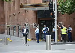 La crisis de rehenes en Sídney tuvo lugar desde la mañana del 15 de diciembre hasta la madrugada del 16 de diciembre de 2014 en Martin Place, en el centro de la ciudad de Sídney (Australia). 17 personas[12] fueron tomadas como rehenes en una cafetería y chocolatería local por Man Haron Monis, un clérigo musulmán radical.[7][8][9][13][14][15] Once personas lograron escapar, seis de ellas luego de una acción policial con explosivos, disparos y destellos de luz en la madrugada del 16 de diciembre.[16][17][18] En la irrupción policial fallecieron Haron, por disparos de la policía, y dos de los rehenes. Otros tres rehenes y un policía resultaron heridos.[19][3]