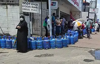El ministro de Hacienda, Basil Rajapaksa, había instado a todas las autoridades gubernamentales a apagar todas las luces de las calles al menos hasta finales de marzo de 2022 en un intento por preservar y conservar la electricidad.[41] Sin embargo, se espera que tenga un impacto significativamente negativo en la tasa de participación de la fuerza laboral femenina, especialmente porque ha afectado la seguridad de las mujeres trabajadoras que trabajan en los turnos de noche en los supermercados y en otros lugares de trabajo.[42] Sri Lanka también está experimentando una de las peores crisis económicas en décadas y la disminución de las reservas de divisas también se siente en el consumo de electricidad, el consumo de combustible y el gas para cocinar, lo que provoca una grave escasez. Casi 1000 panaderías han sido cerradas como respuesta a la escasez de gas para cocinar provocada por la caótica crisis de las reservas de divisas.[43] En los últimos meses se han formado largas colas frente a las gasolineras debido a la escasez de combustible debido a la crisis de las reservas de divisas.[44] El aumento de los precios mundiales del petróleo agravó aún más la escasez de combustible en Sri Lanka, ya que el país tuvo que pagar más que antes para obtener el suministro de combustible con el riesgo de una mayor salida de reservas de divisas.[45][46]