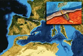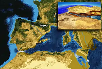 La crisis salina terminó con la inundación de enormes dimensiones del Mediterráneo por aguas Atlánticas hace unos 5,33 Ma,[4] a través de un paso abierto en el actual estrecho de Gibraltar.[5]