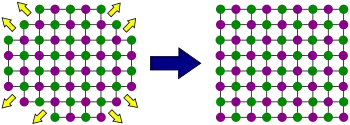 Cuando un cristal de halita está creciendo, los nuevos átomos pueden unirse muy fácilmente a las partes irregulares de la estructura de la superficie a escala atómica mediante enlaces fijos. Por lo tanto, estas partes del cristal crecen muy rápidamente (flechas de color amarillo). Con el tiempo, toda la superficie se compone de sucesivas capas de energía superficial equivalente estables y lisas. En estas caras o facetas, es más difícil que nuevos átomos formen enlaces fijos con los anteriores, propiciando la formación de planos de exfoliación.
