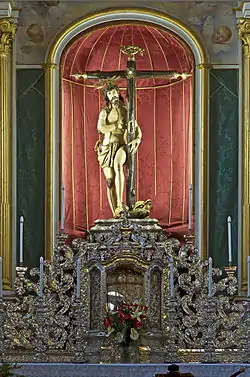 La imagen, llegada a Tenerife desde Madrid en el año 1661 por Tomás Perera de Castro, creó ciertos recelos[2] ya que representa un hombre desnudo abrazado a la cruz, vivo a pesar de sangrar abundantemente por sus llagas abiertas en las manos, pies, rodillas y espaldas, más la de una lanzada en el costado, y cuyo pie izquierdo aplasta una calavera en torno a la cual se arrollaba una serpiente con una manzana en la boca. Su iconografía se basa en el Varón de dolores.